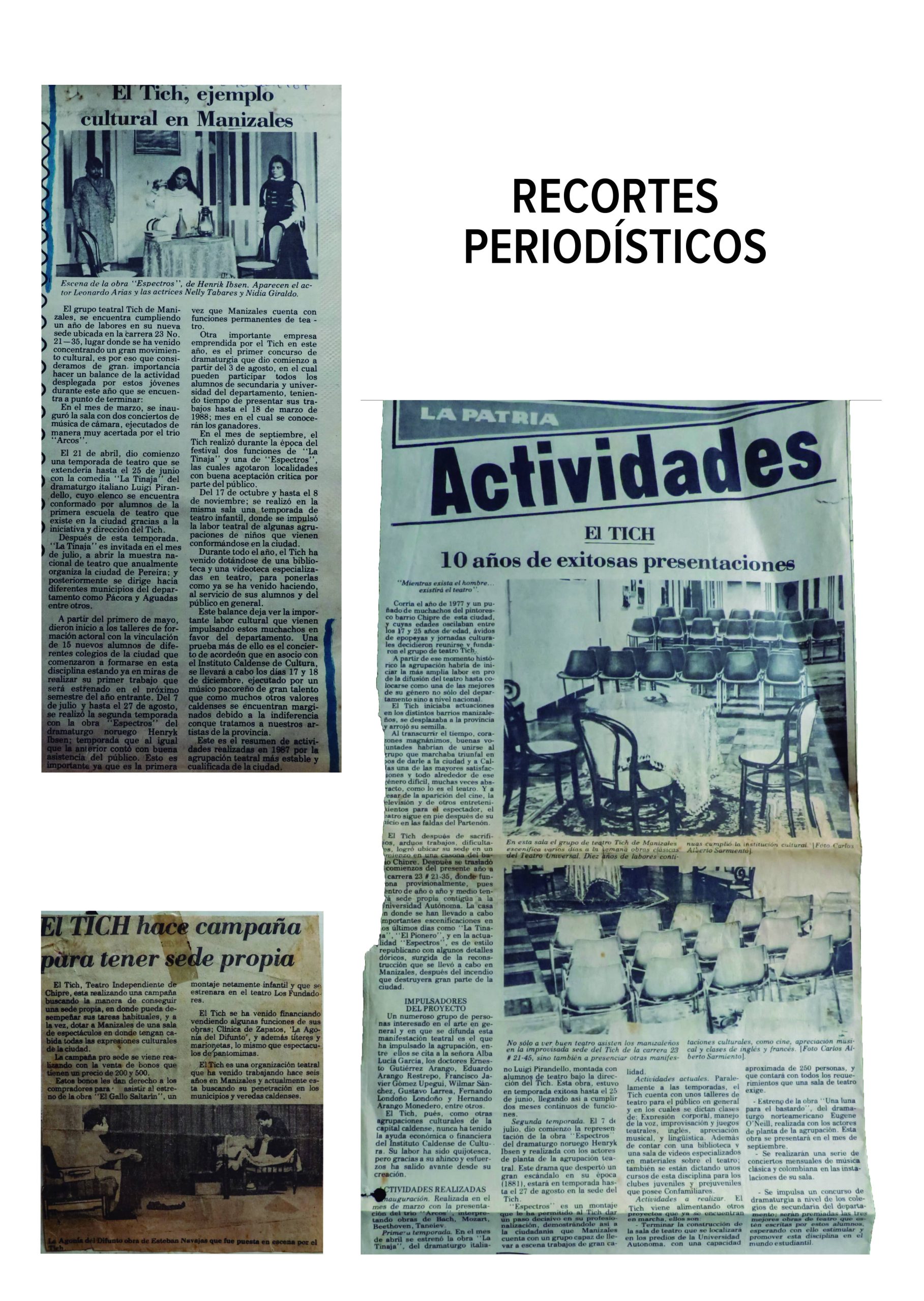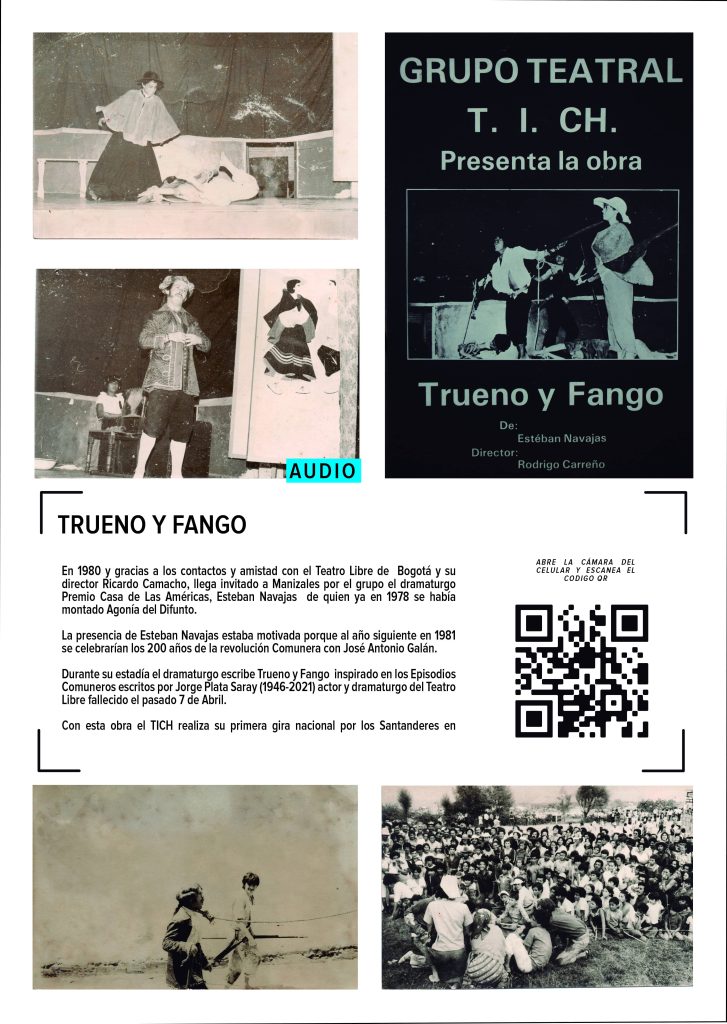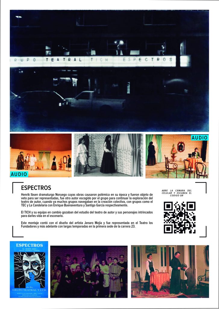 Aquí veremos material audiovisual recuperado tanto del archivo del grupo, como de colecciones personales de algunos integrantes que hicieron parte del grupo en algún momento. También se pueden escuchar audios de testimonios que documentan los distintos momentos vividos por el grupo, anécdotas, formas de trabajo y otros comentarios, que hacen más ameno este recorrido por las salas adaptadas técnicamente por el grupo teatral Tich para esta exposición.